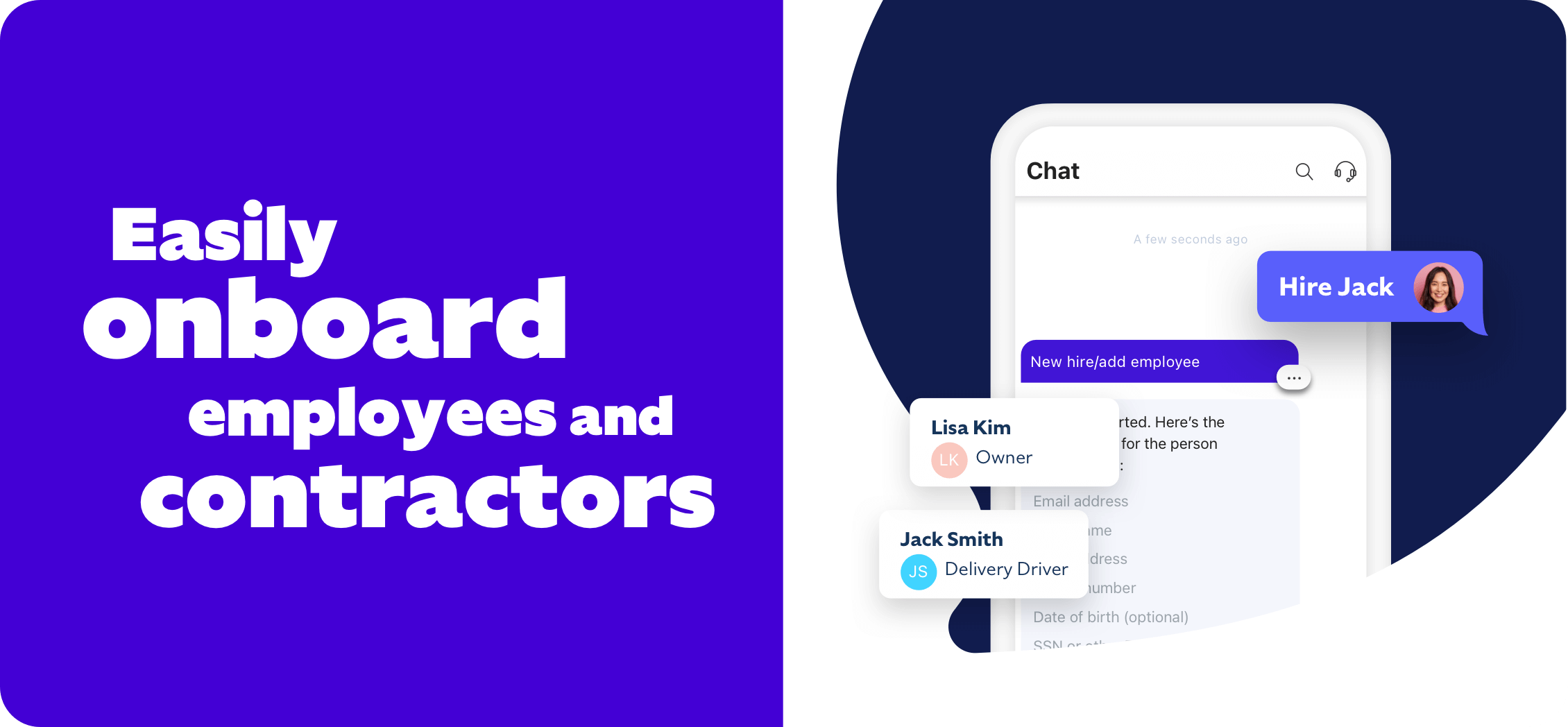 The Roll app makes adding 1099 contractors (or full-time employees, for that matter) easy. Just chat “Hire employee” and Roll will guide you through each step. No training or tutorials needed. You’ll indicate whether the worker is an employee (W-2) or an independent contractor (1099) and answer a few simple questions.
